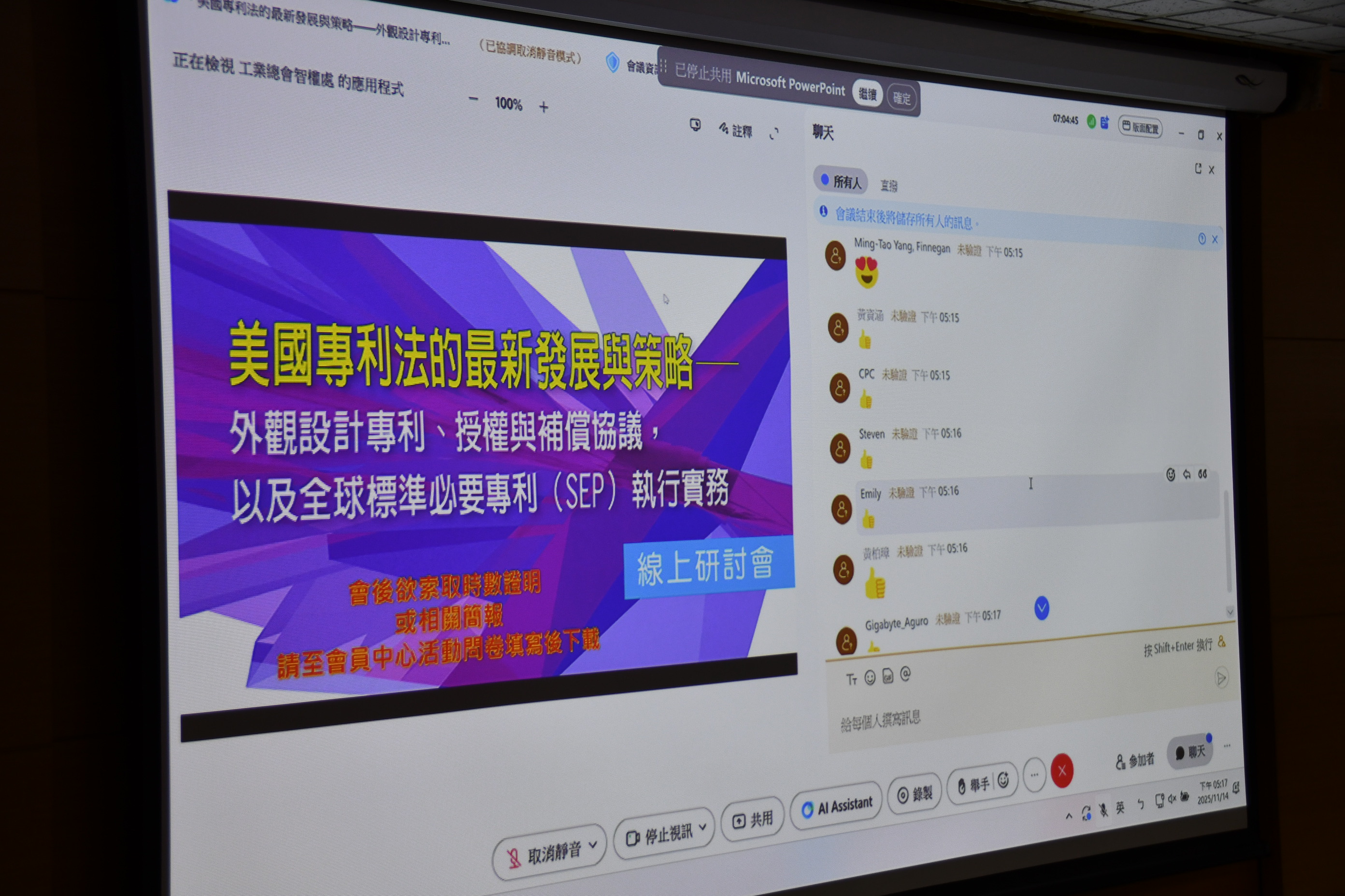 台商大陸智財權服務網-圓滿舉辦11月14日下午「美國專利法的最新發展與策略—外觀設計專利、授權與補償協議,以及全球標準必要專利(SEP)執行實務」研討會