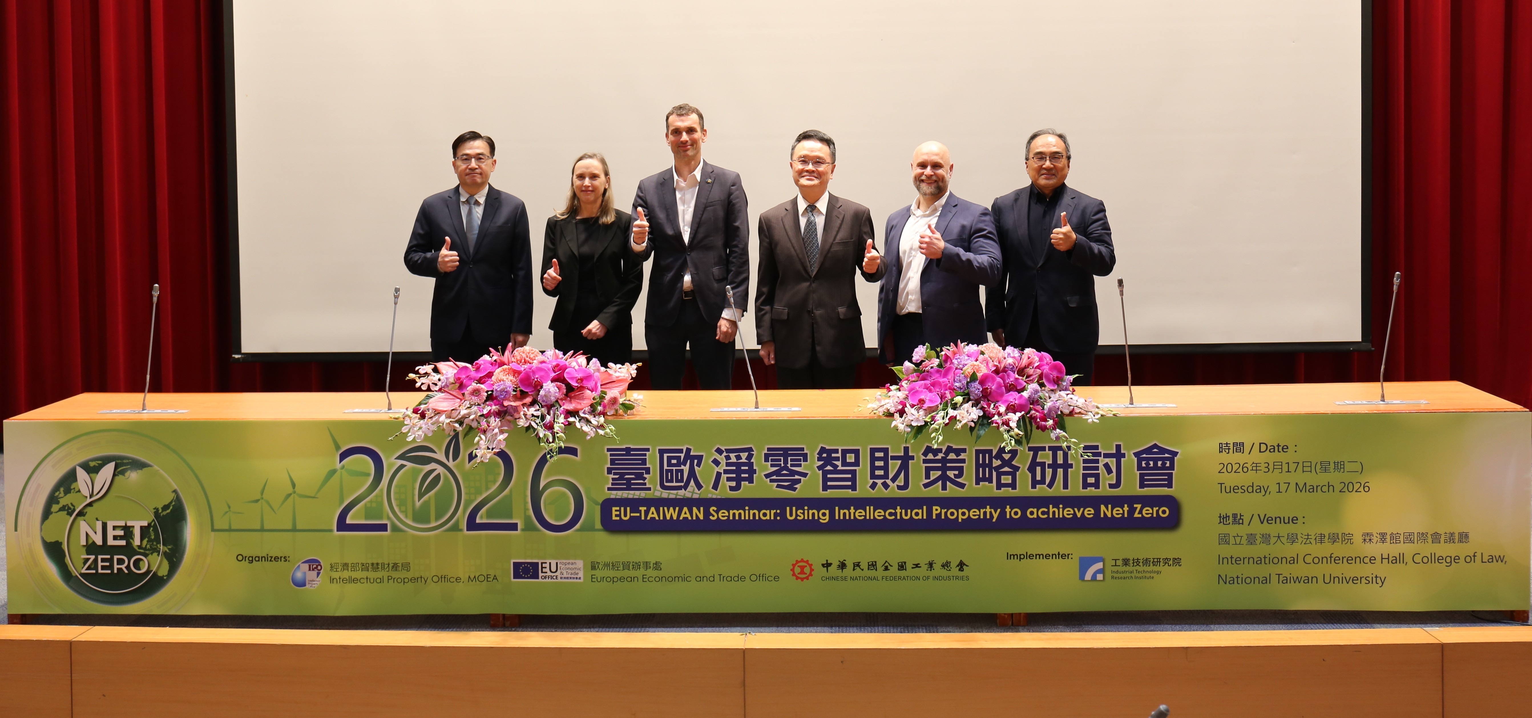「2026臺歐淨零智財策略研討會」於3月17日(星期二) 下午在臺灣大學法律學院霖澤館舉行,由經濟部智慧財產局廖承威局長、歐洲經貿辦事處邵恩博組長擔任致詞貴賓。